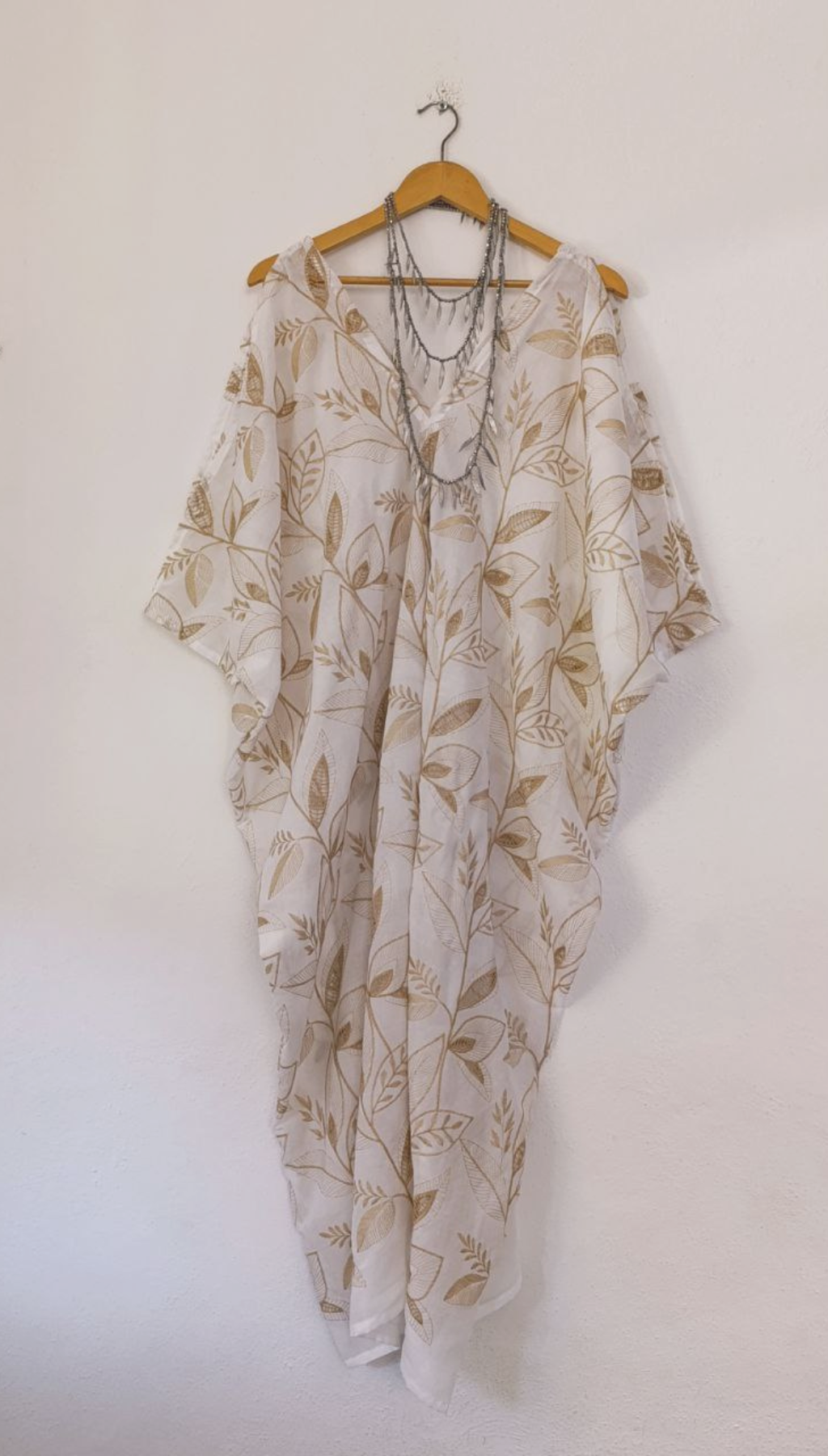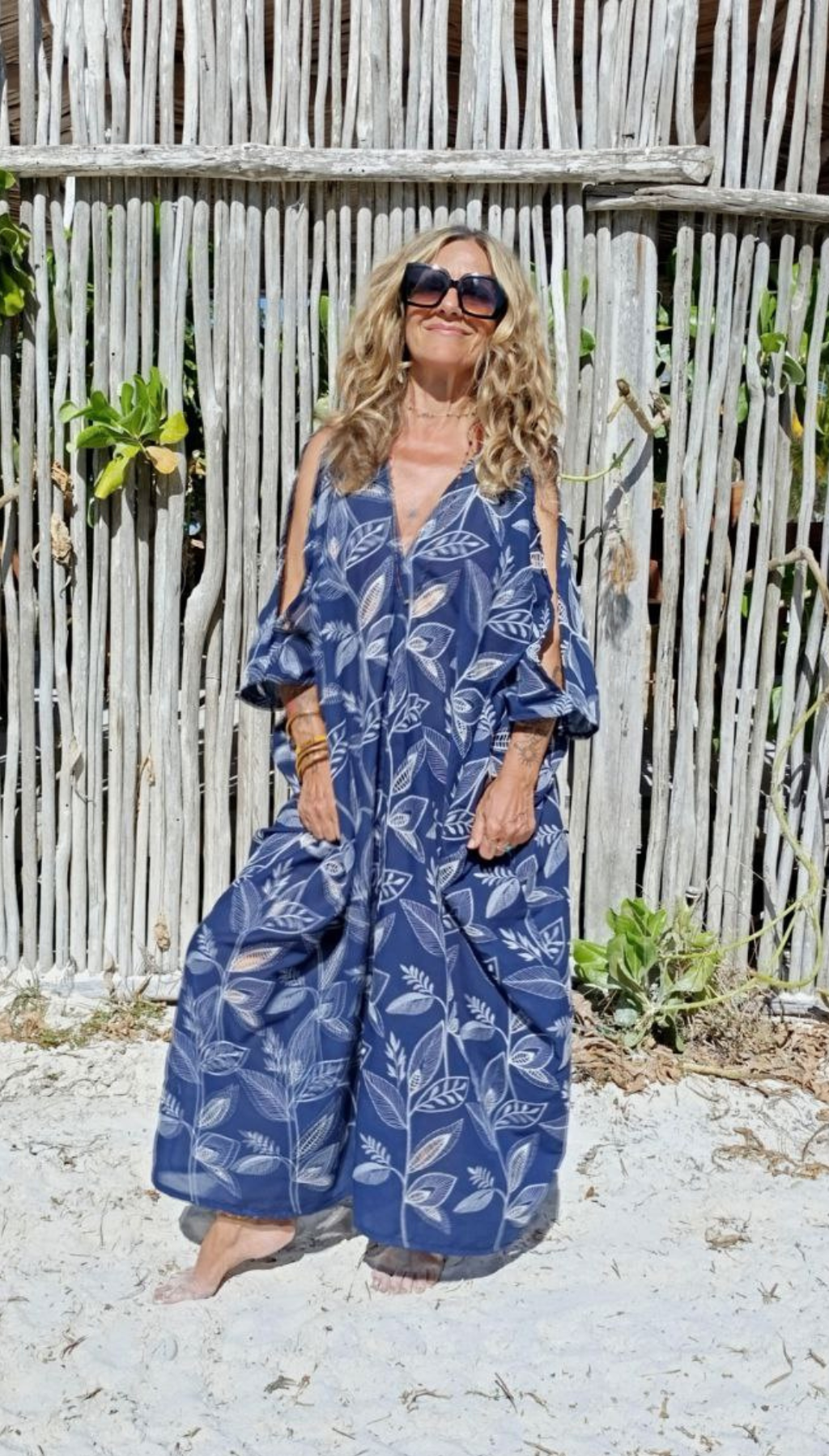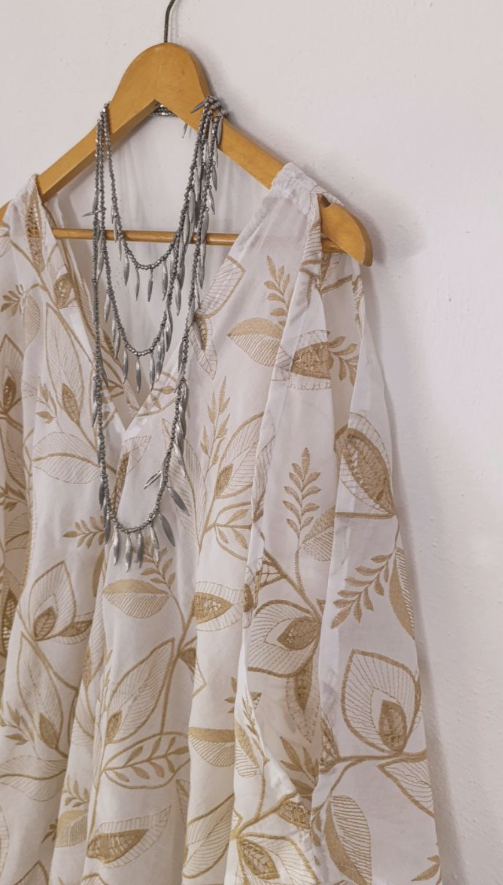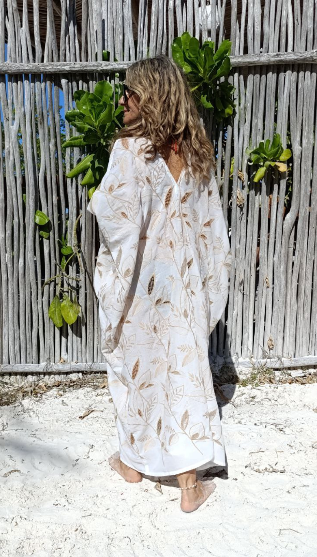 Precioso kaftán, súper femenino y con sus hombros descubiertos. Confeccionado en algodón finito, su detalle de flores bordadas añade un toque único. Ideal para brillar en cualquier ocasión. Es de nuestra firma María Free.