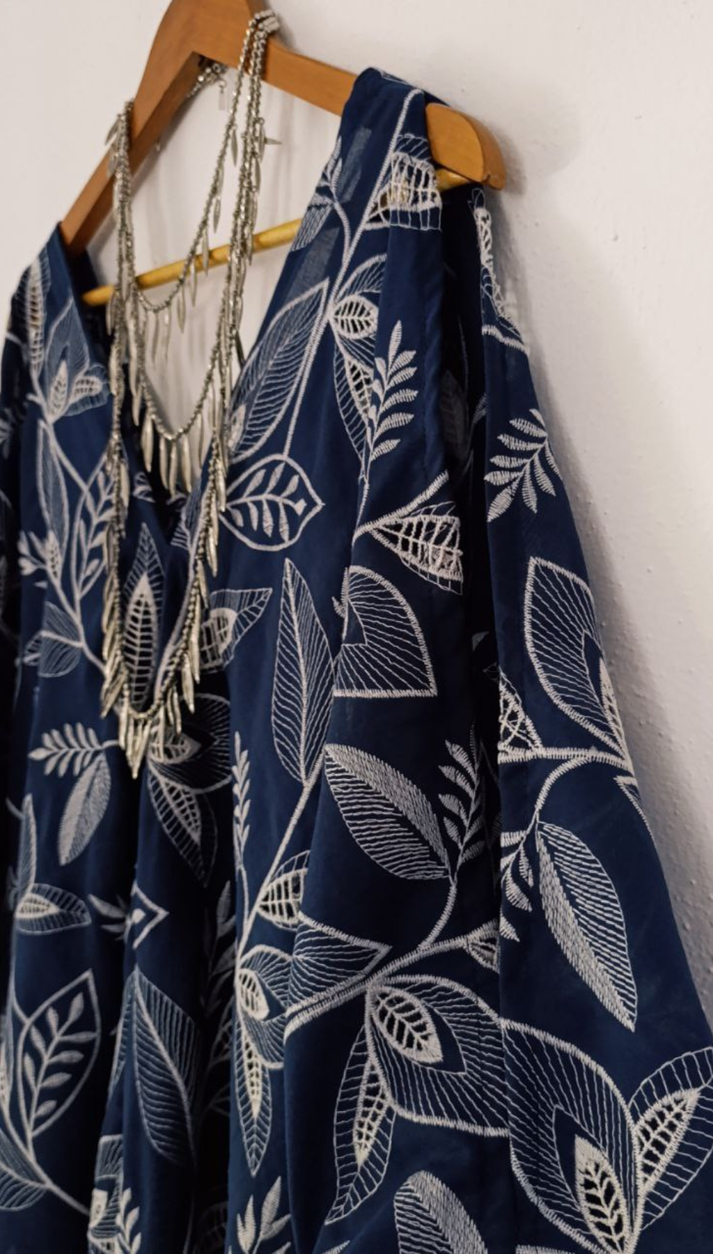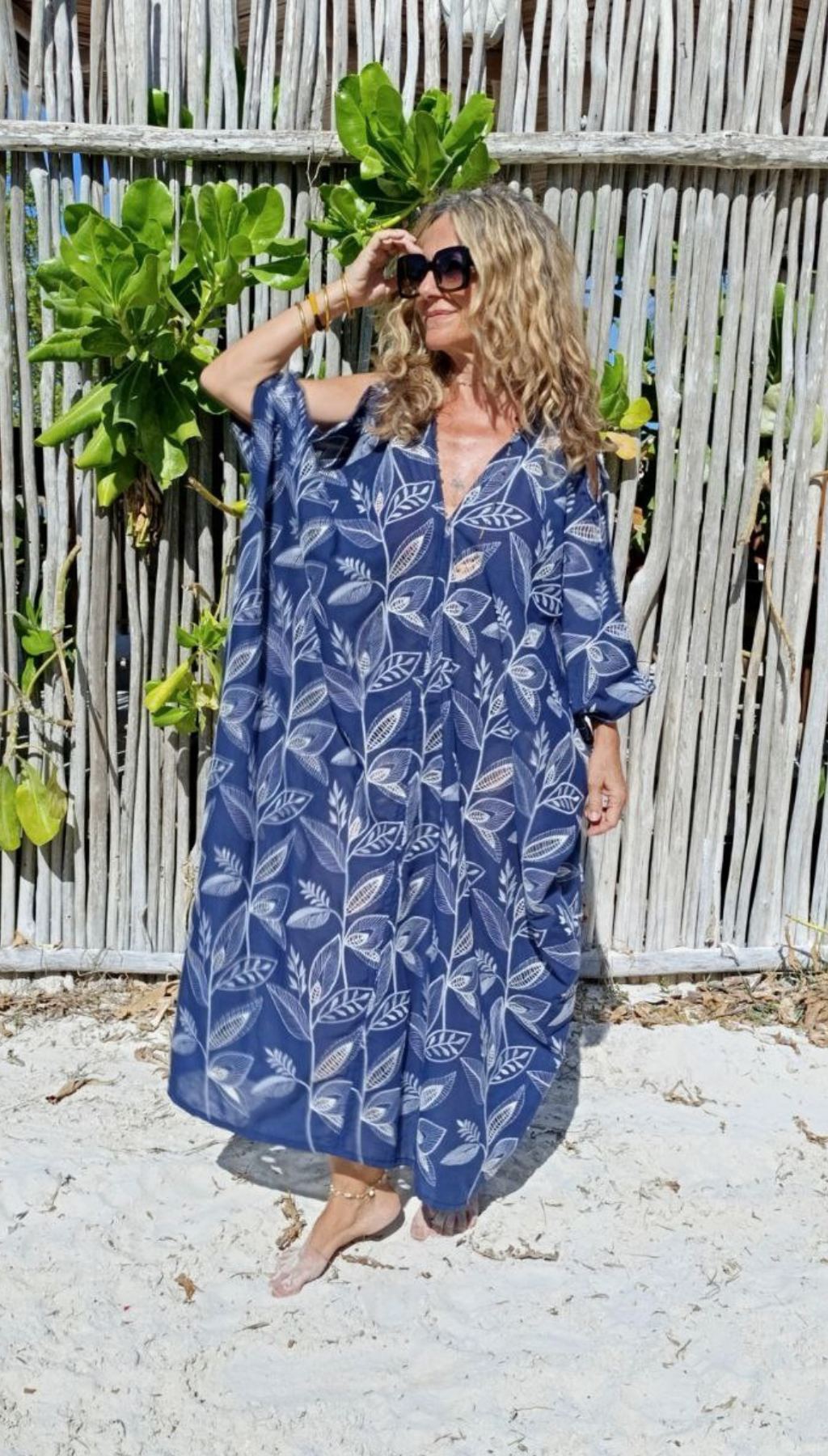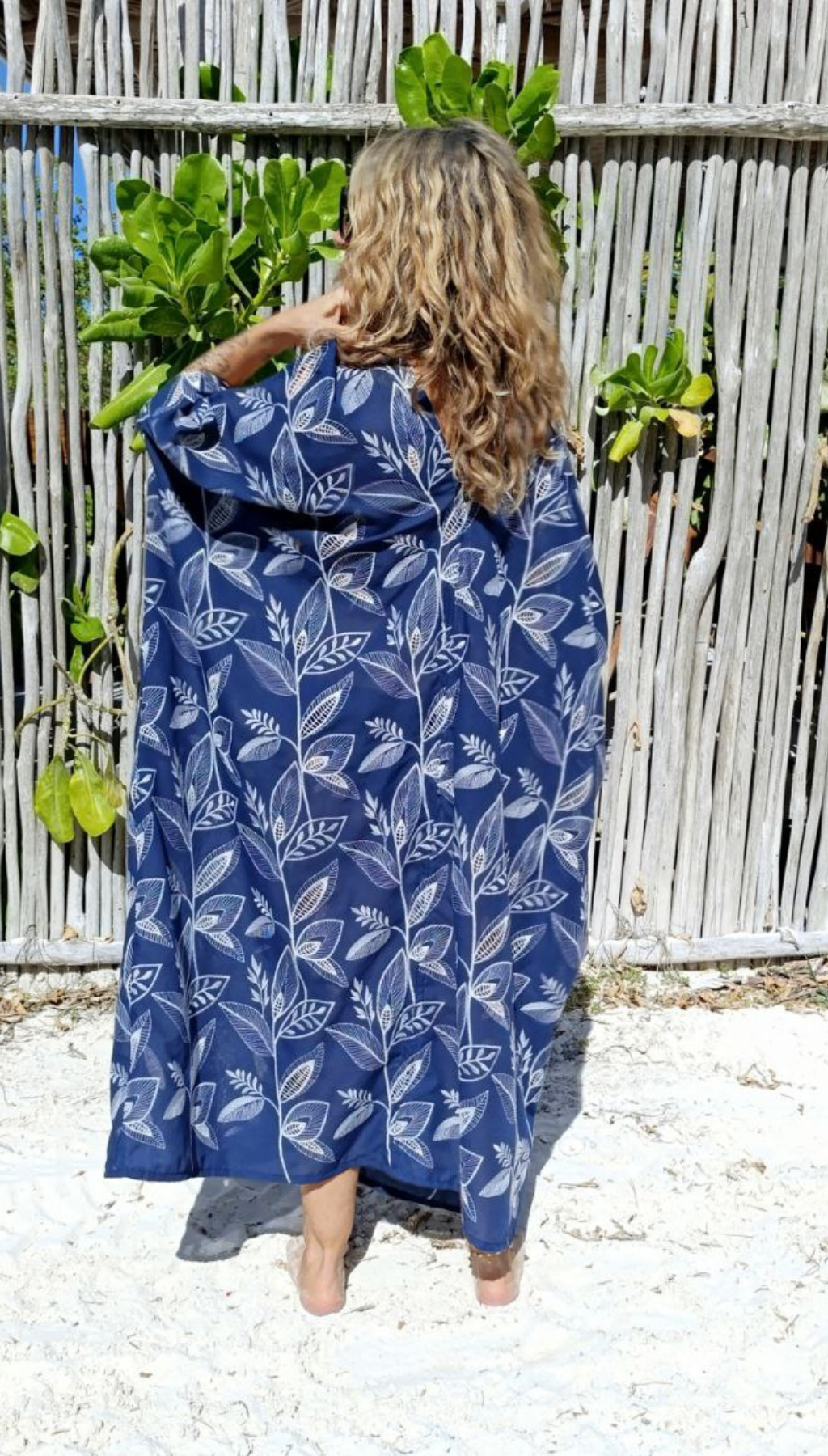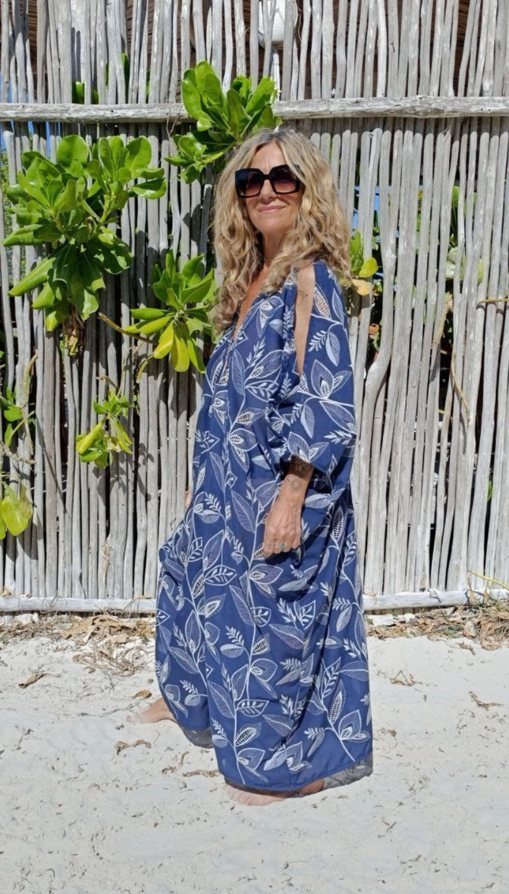 Precioso kaftán, súper femenino y con sus hombros descubiertos. Confeccionado en algodón finito, su detalle de flores bordadas añade un toque único. Ideal para brillar en cualquier ocasión. Es de nuestra firma María Free.