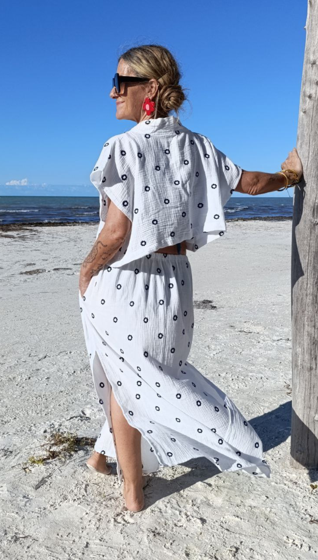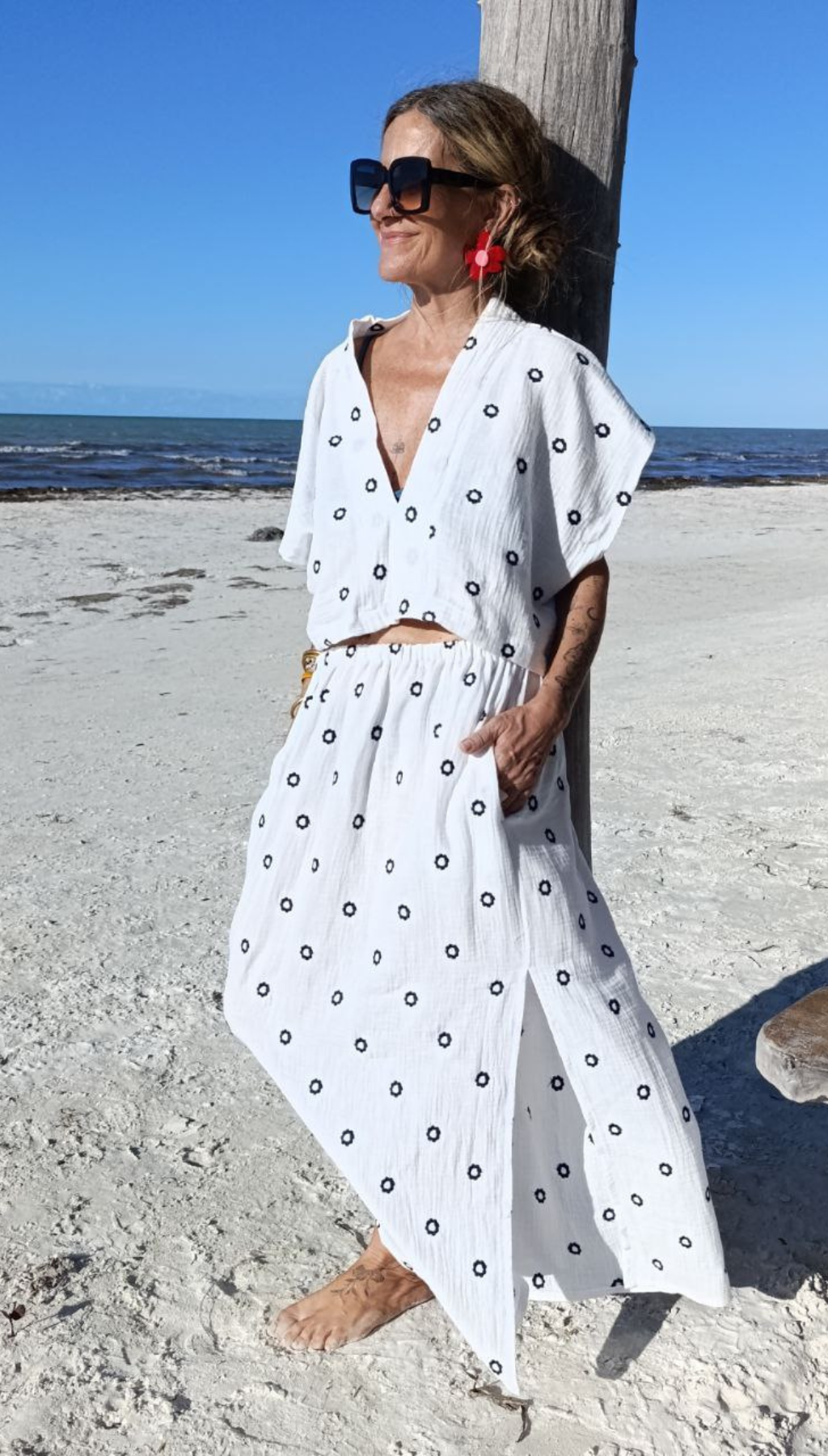 ¡Luce elegante y cómoda con nuestra falda! Hecha de suave algodón baby cotton, con aberturas laterales y perfecta para combinar con el top del set a juego. ¡Hazte con esta prenda de nuestra firma Maria Free y siente su comodidad y estilo en cada paso!